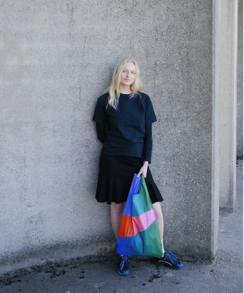 クラシカルなビニール袋の形に、サイドの折り目が深く入った機能的なショッピングバッグ。使い捨てのビニール袋に代わるバッグを作り、そこから生まれるゴミを減らしたいというスーザンの想いから誕生しました。