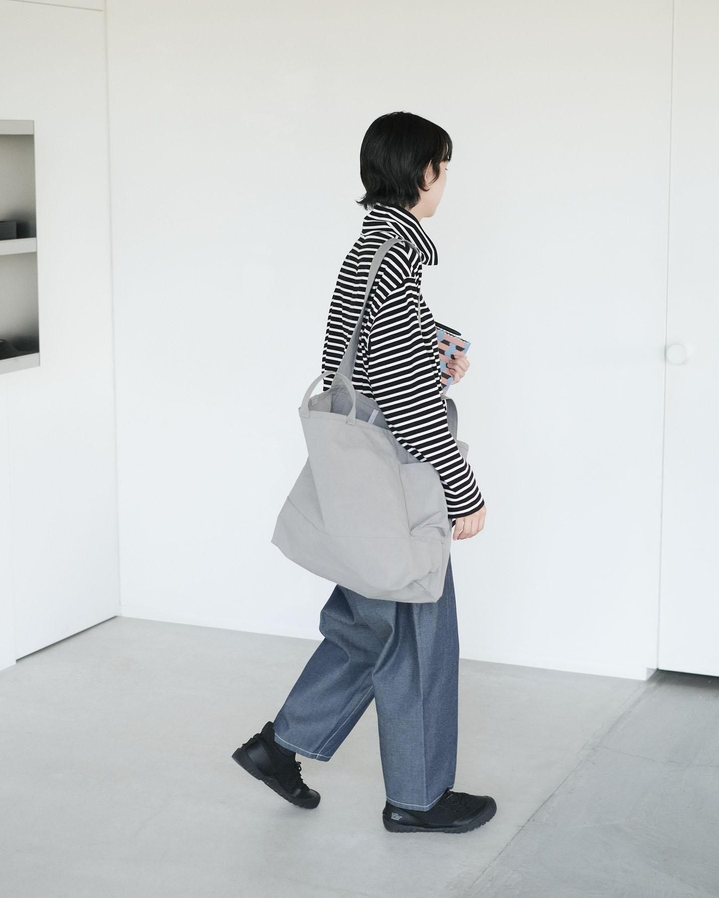 強撚した綿の32番単糸を2本引き揃えて天竺で編み上げた生地のタートルネックの長袖Tシャツです。少しドロップショルダーで、袖は若干長めの作りです。何よりも立体的かつ大きめに作られた首元が魅力的です。