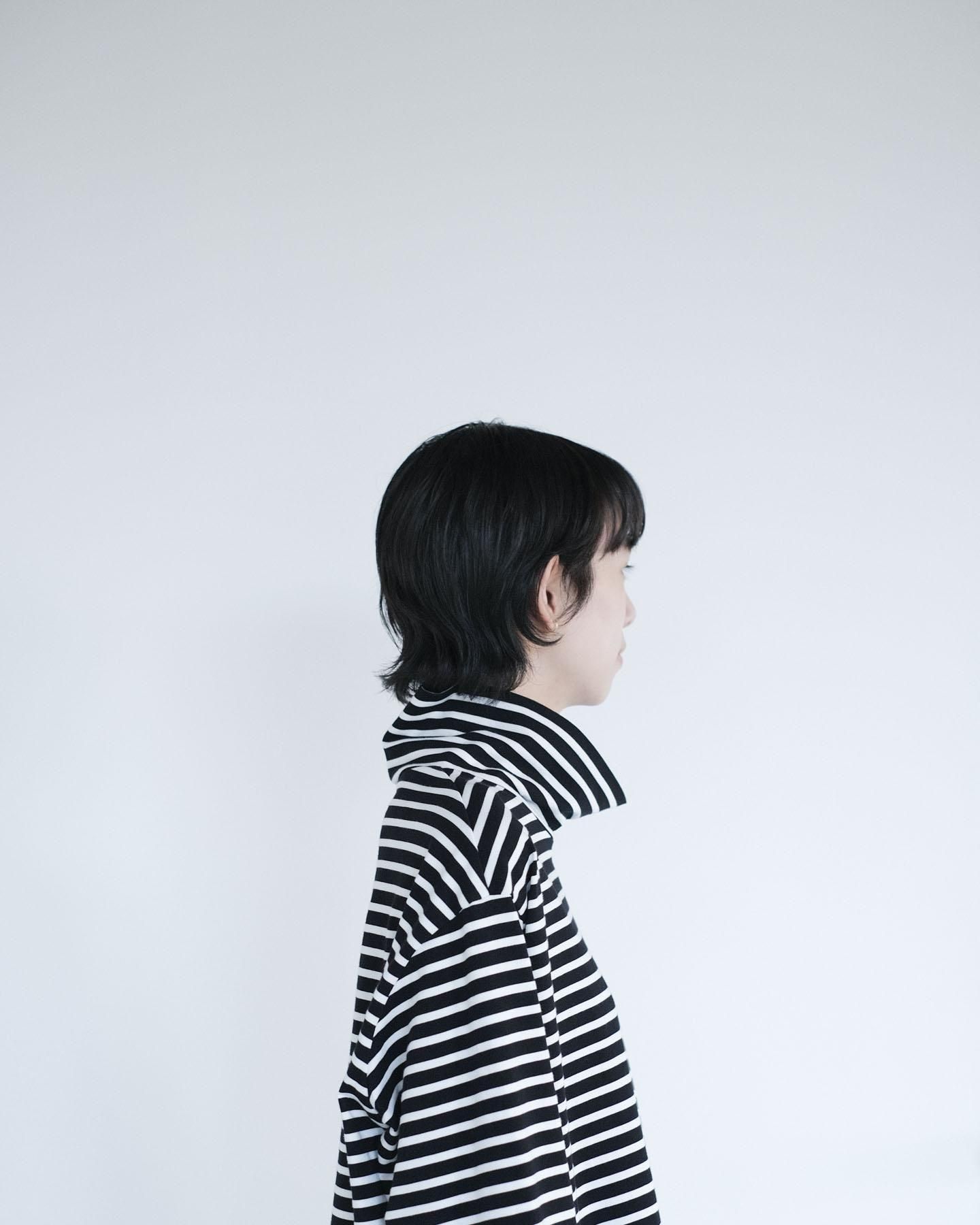 強撚した綿の32番単糸を2本引き揃えて天竺で編み上げた生地のタートルネックの長袖Tシャツです。少しドロップショルダーで、袖は若干長めの作りです。何よりも立体的かつ大きめに作られた首元が魅力的です。