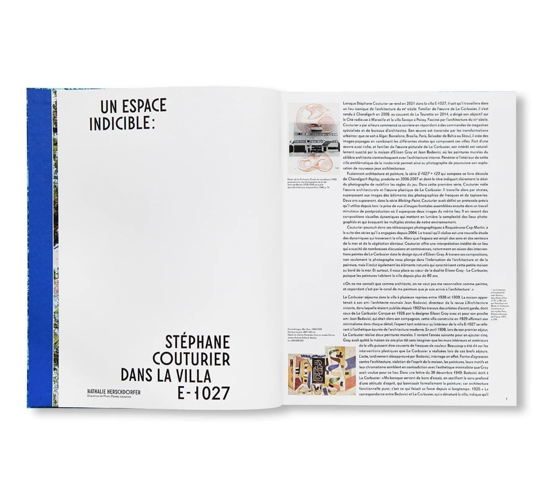 作者は、現代において写真という表現のもと、その建築様式、描かれたフレスコ画、家具、外の空間を重ね合わせることで時代を融合させ、空間を再構築し、この象徴的な場所の歴史をスケッチしている。透明感が持つ自由さ、自然と建築がもたらす望遠鏡のような描写、ル・コルビュジエのフレスコ画とアイリーン・グレイがデザインした家具の細部を写し出すことで、この場所に誇らしさをもたらしている。そこから生まれる二重性をもったイメージは、動き、不安定さ、儚さ、ドキュメントとフィクションの間にある物事と世界における新たな認識を表現すべく、現実がもつレイヤーを複雑にすることができる。