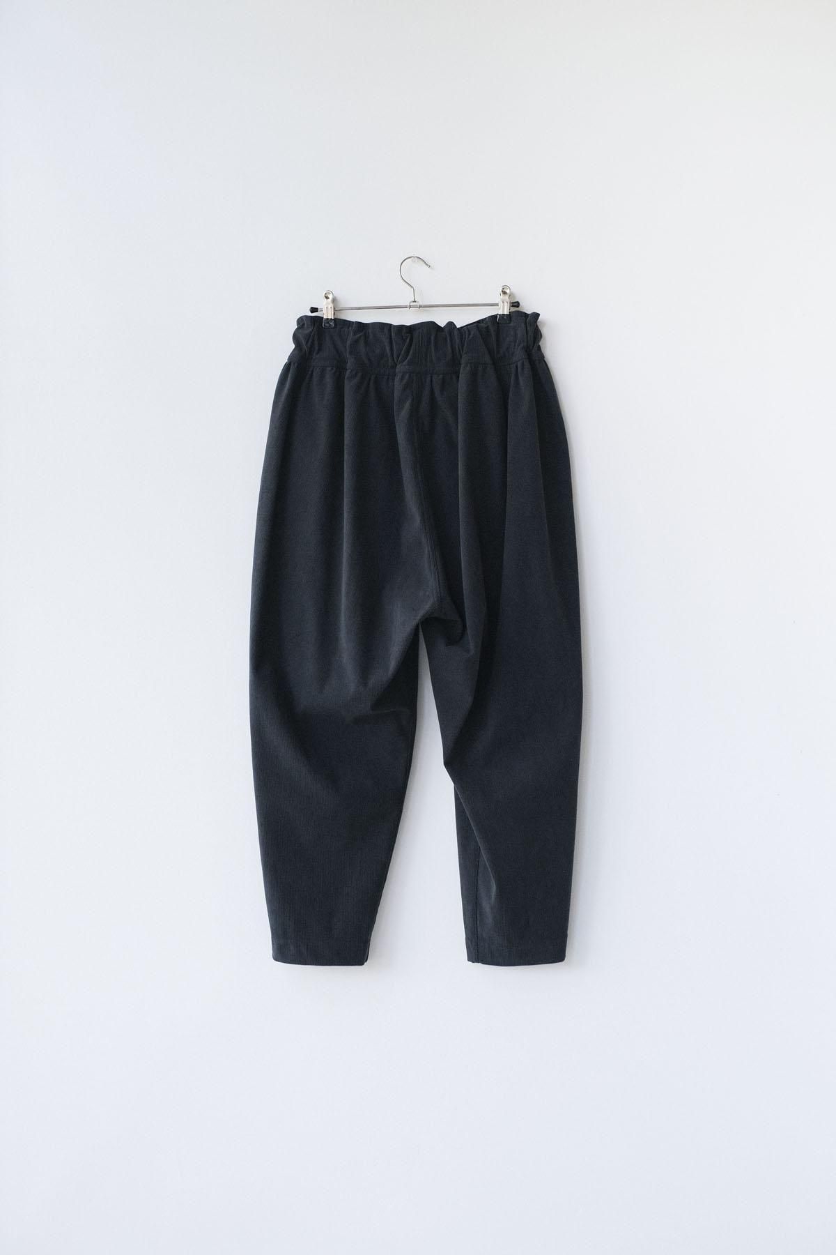 経編みでコーデュロイを表現したポリエステル・トリコット編みのニット生地テーパードパンツ。