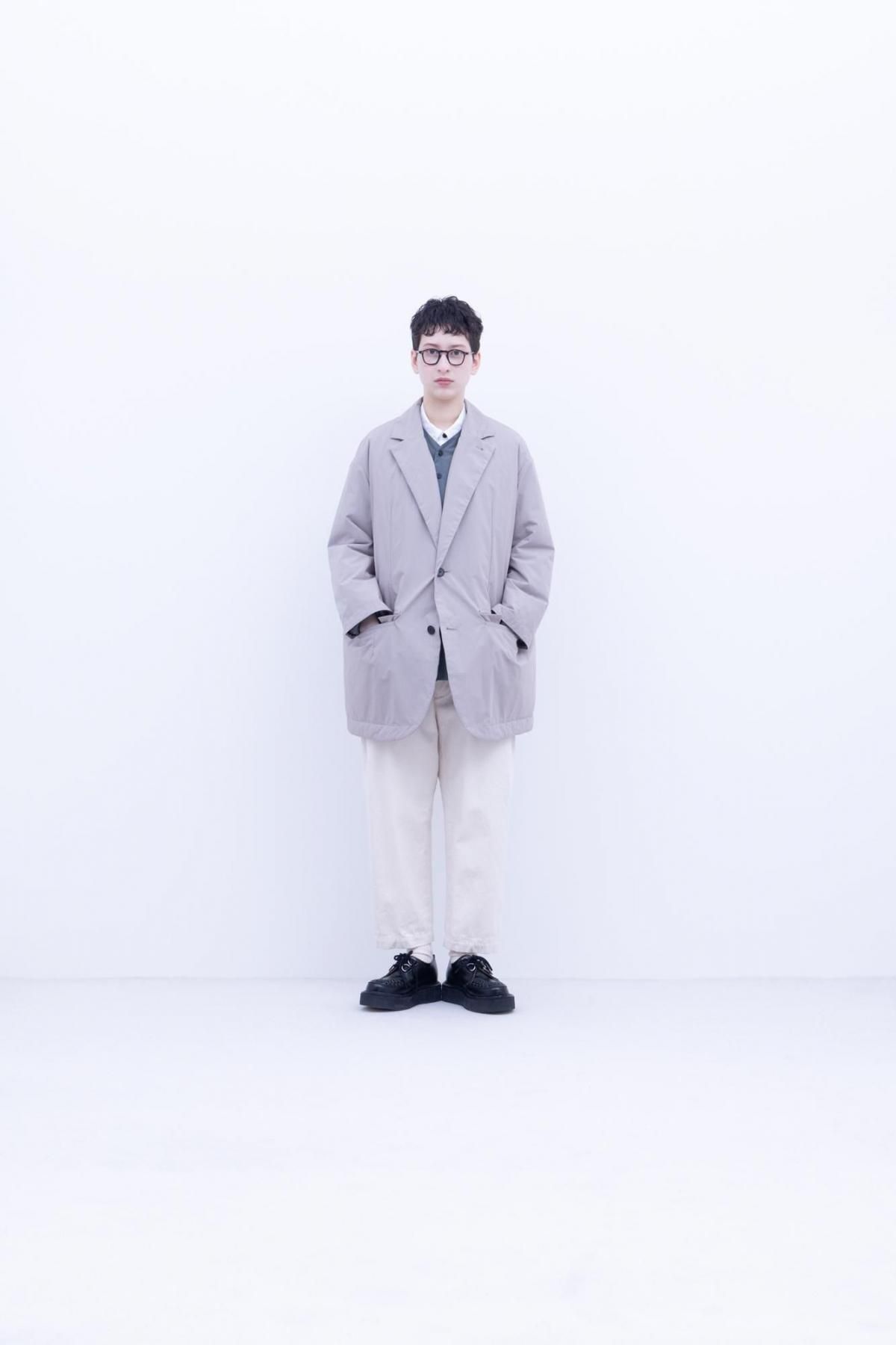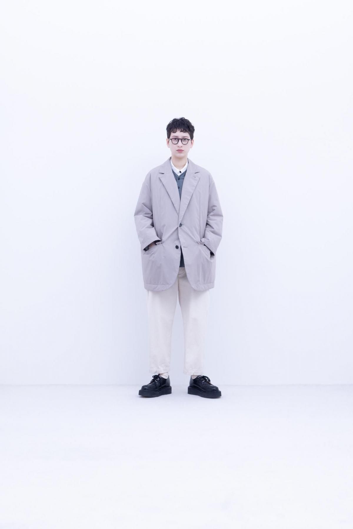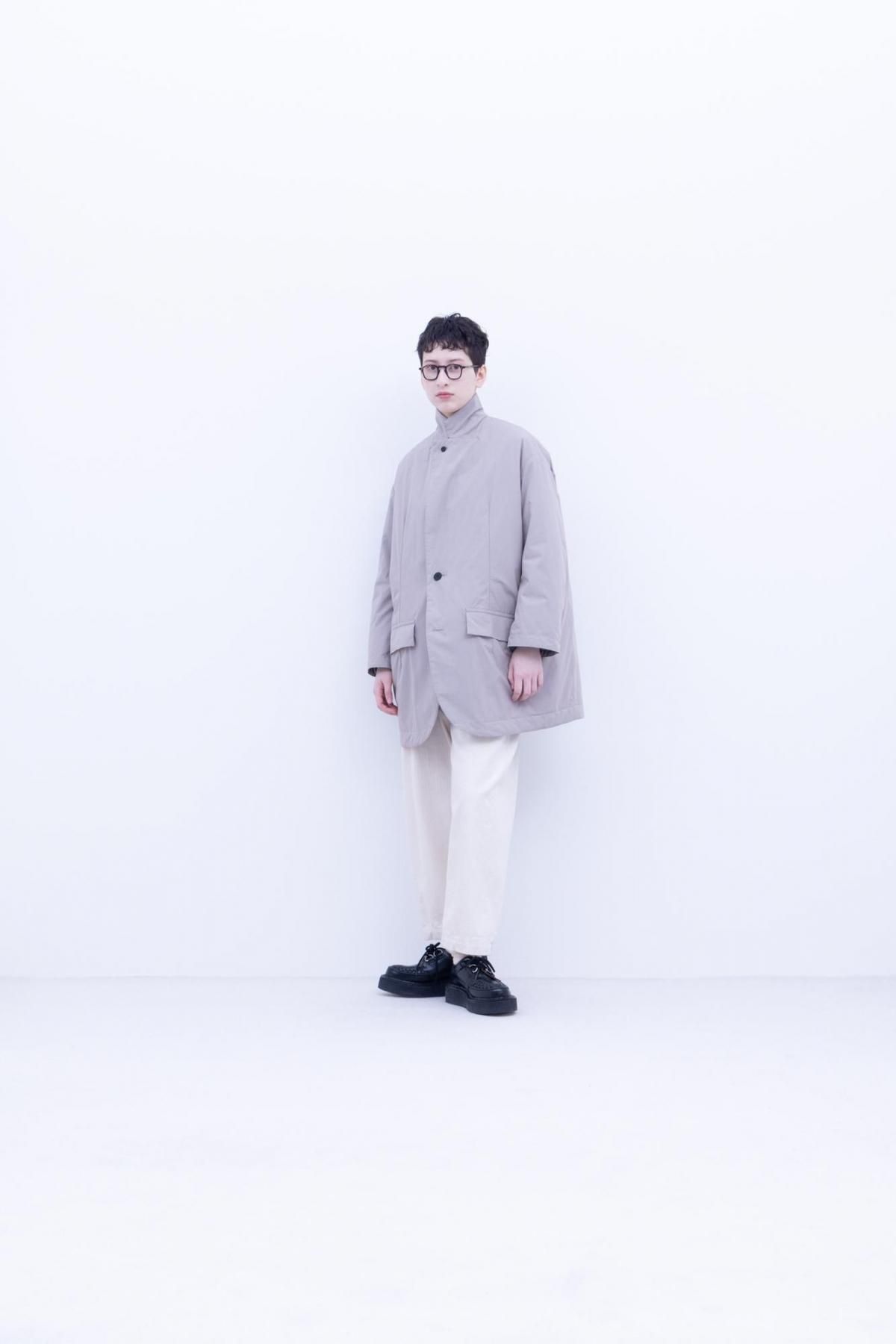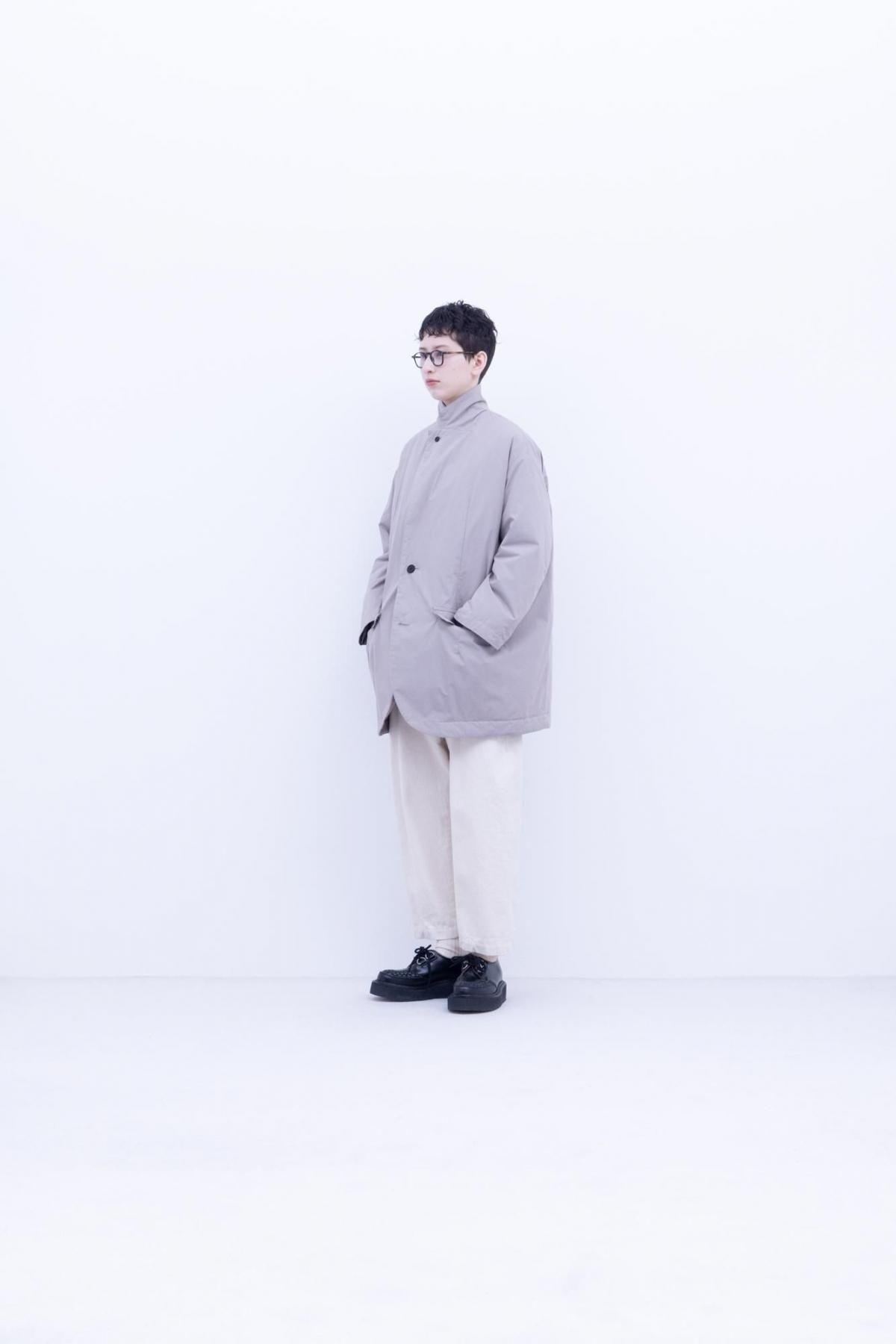 総裏仕立てで中綿は三菱ケミカルを使用しているため薄手でも保温性に優れており、軽さと柔らかな肌触りが特徴です。ふんわりとオーバーサイズの仕上がりで、襟部分をたてての着用も可能です。