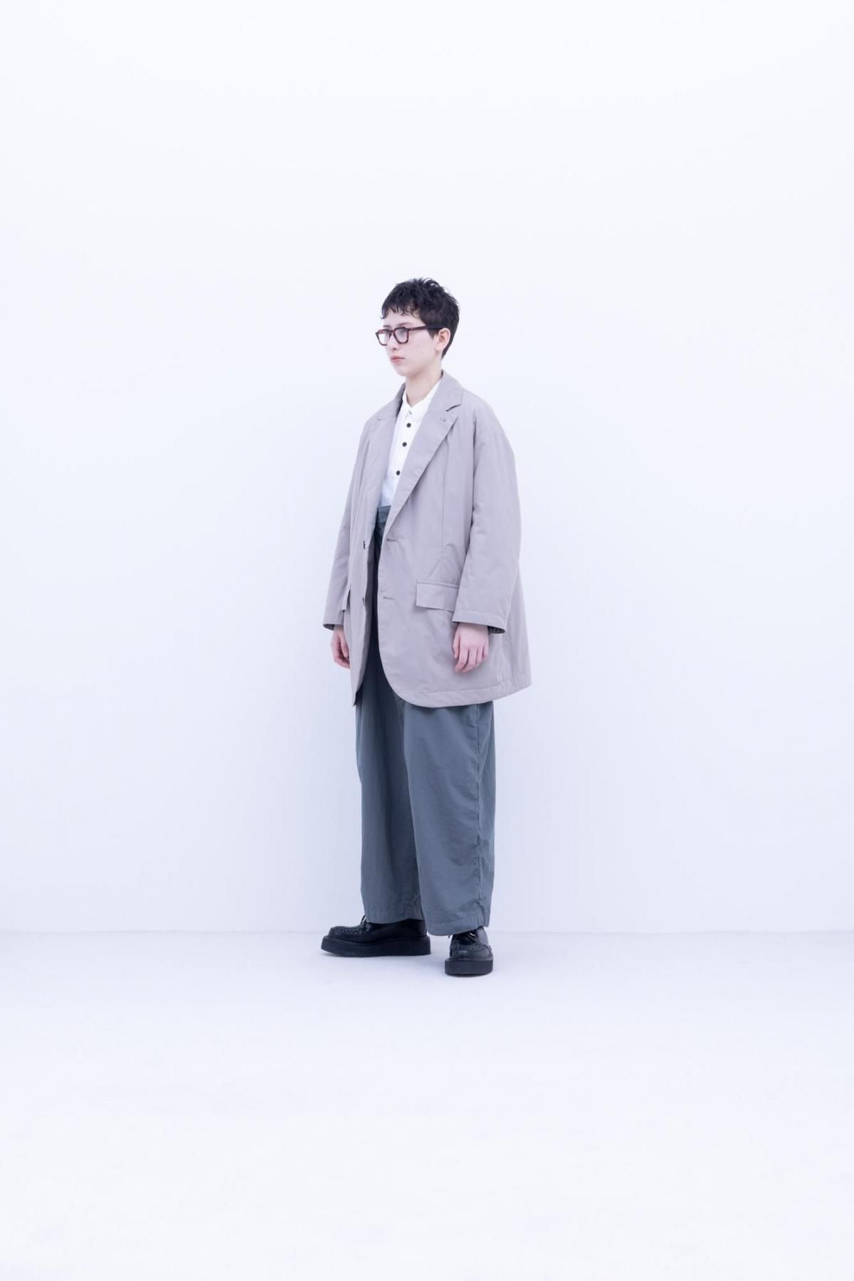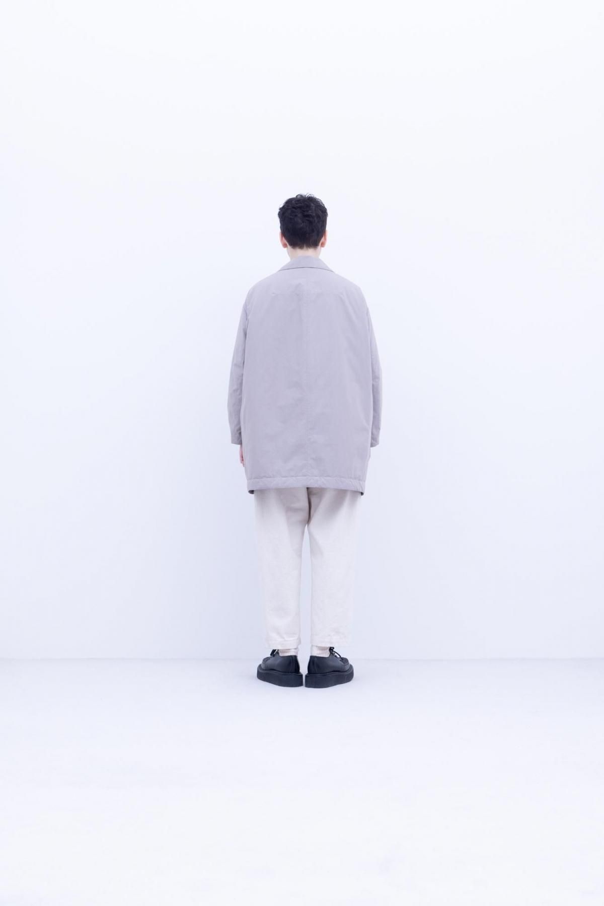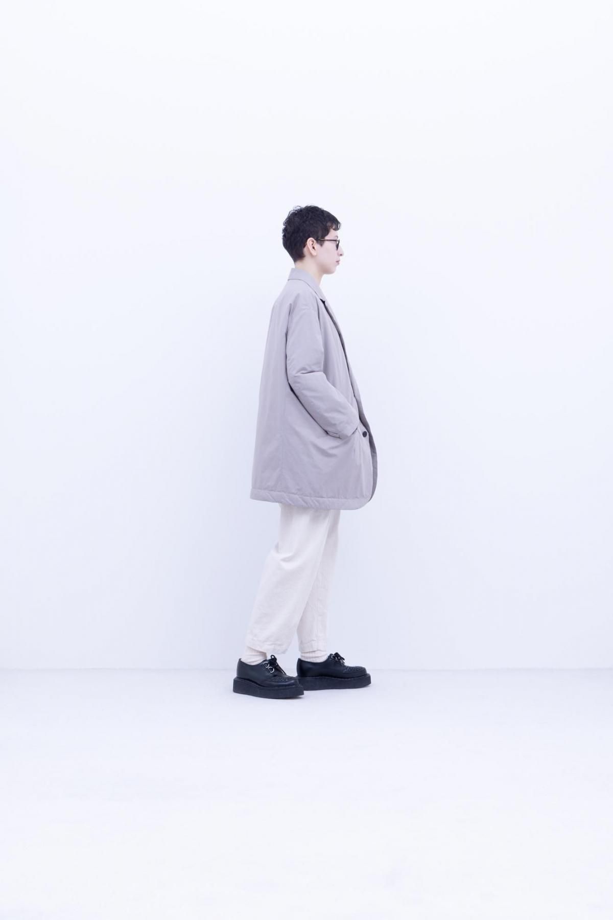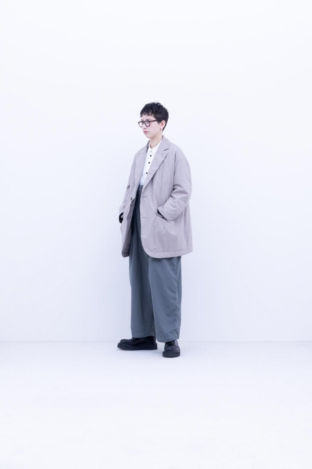 総裏仕立てで中綿は三菱ケミカルを使用しているため薄手でも保温性に優れており、軽さと柔らかな肌触りが特徴です。ふんわりとオーバーサイズの仕上がりで、襟部分をたてての着用も可能です。