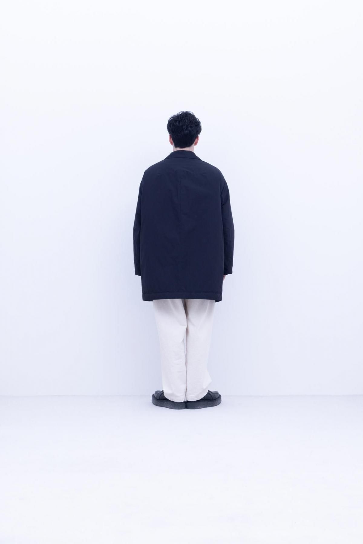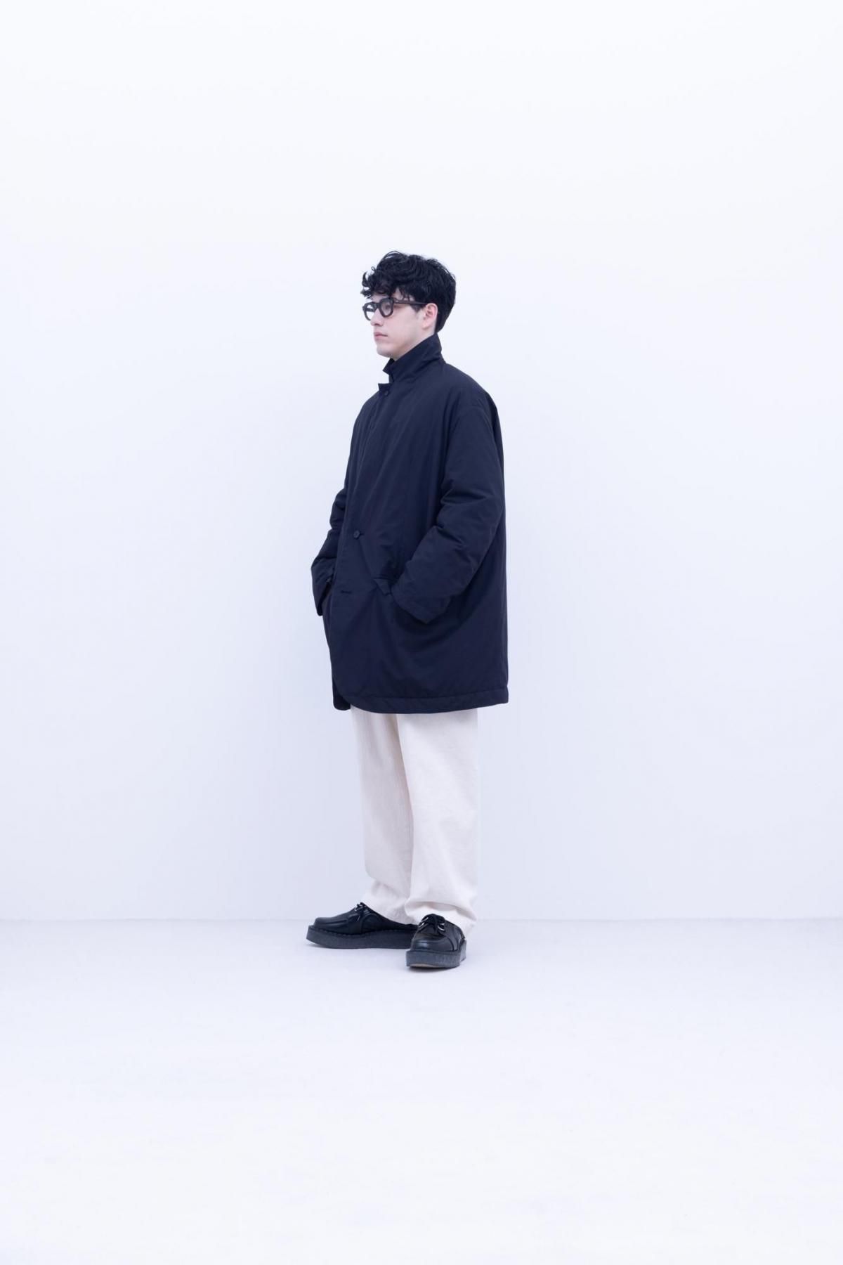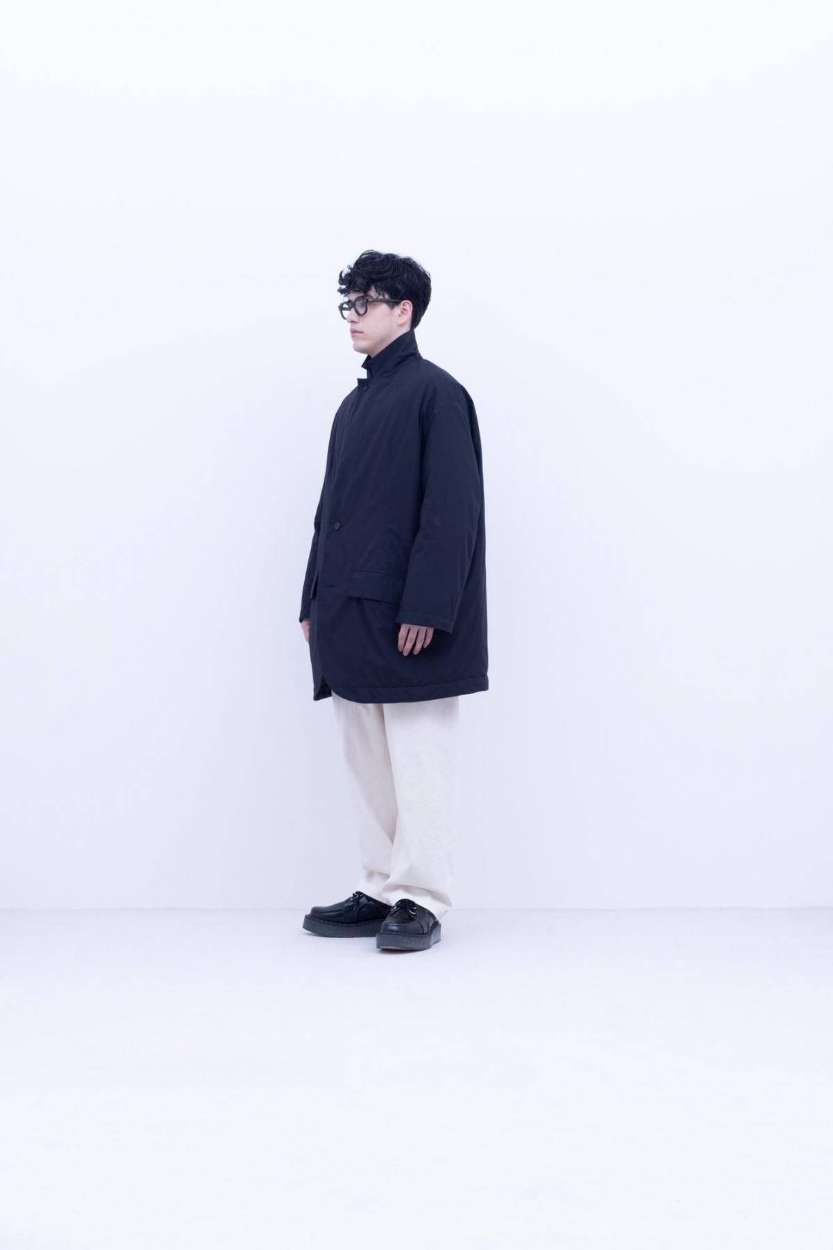 総裏仕立てで中綿は三菱ケミカルを使用しているため薄手でも保温性に優れており、軽さと柔らかな肌触りが特徴です。ふんわりとオーバーサイズの仕上がりで、襟部分をたてての着用も可能です。