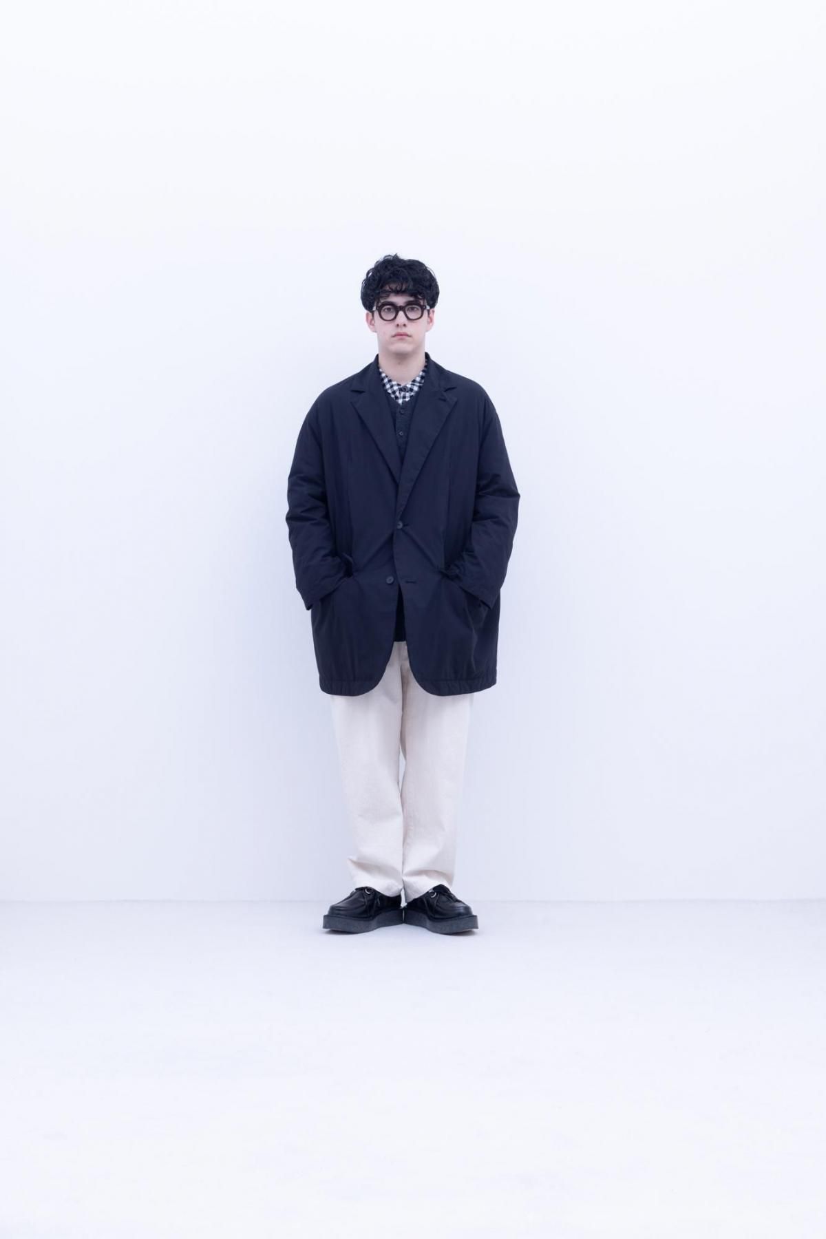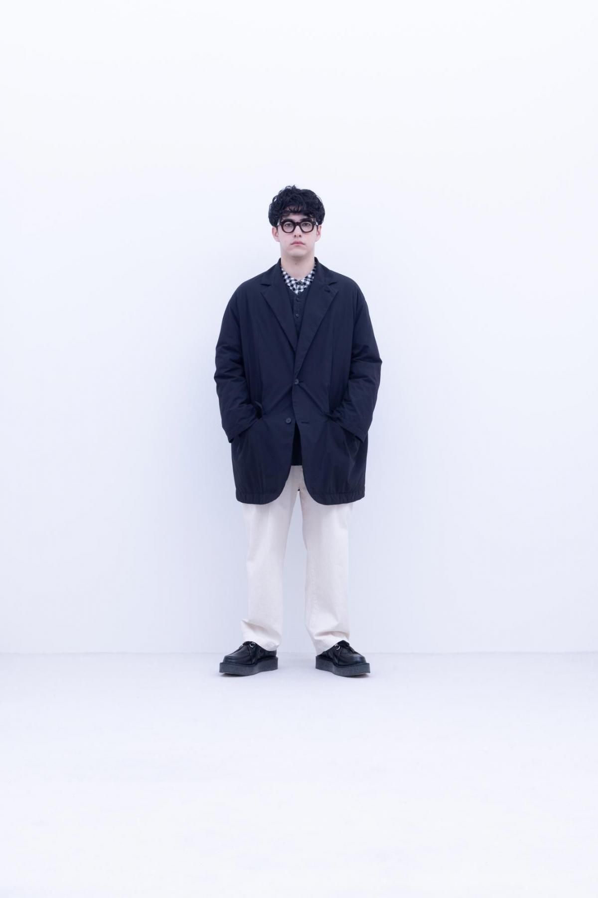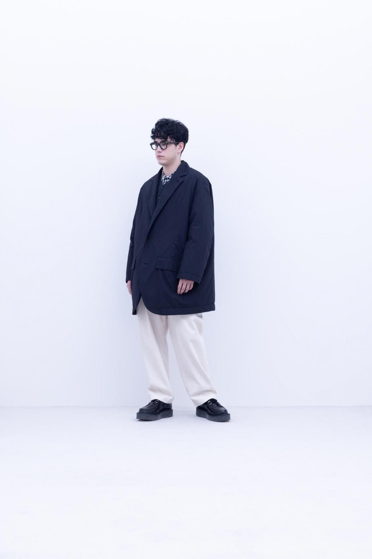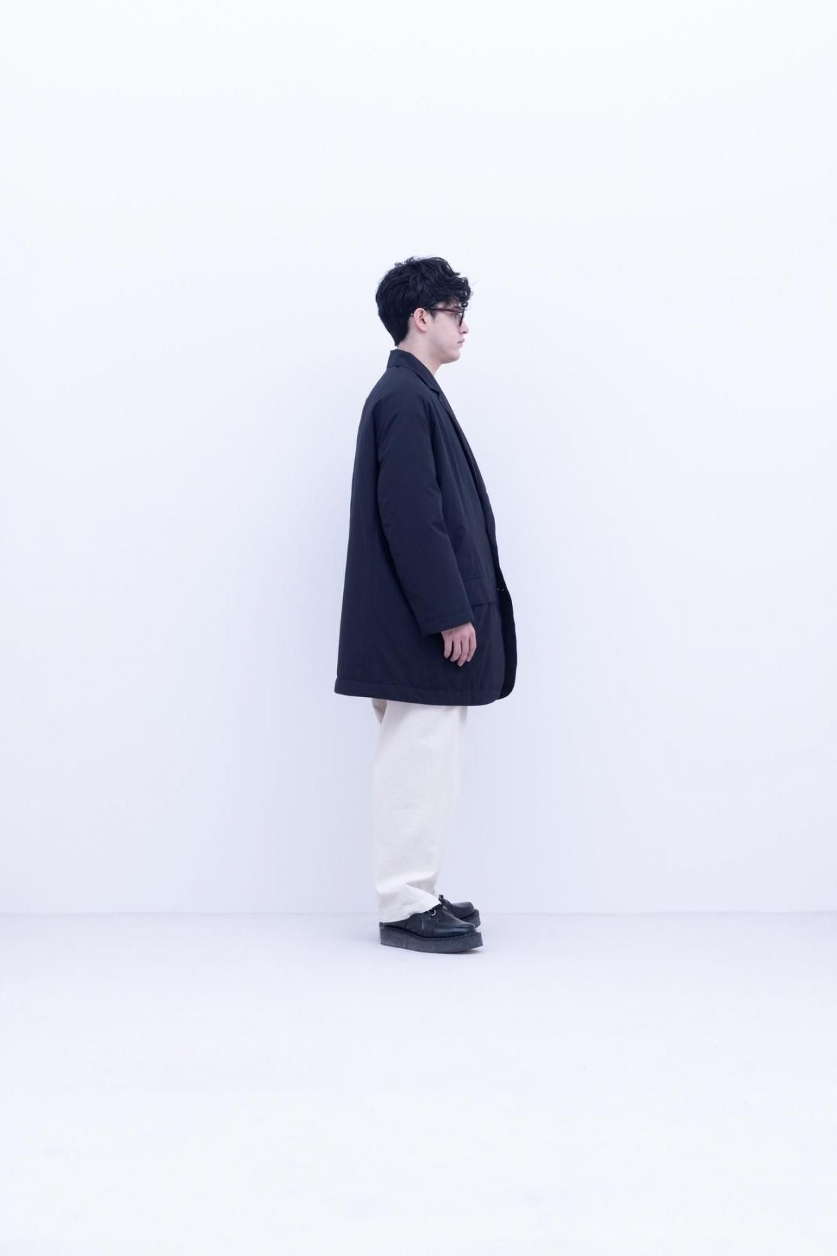 総裏仕立てで中綿は三菱ケミカルを使用しているため薄手でも保温性に優れており、軽さと柔らかな肌触りが特徴です。ふんわりとオーバーサイズの仕上がりで、襟部分をたてての着用も可能です。