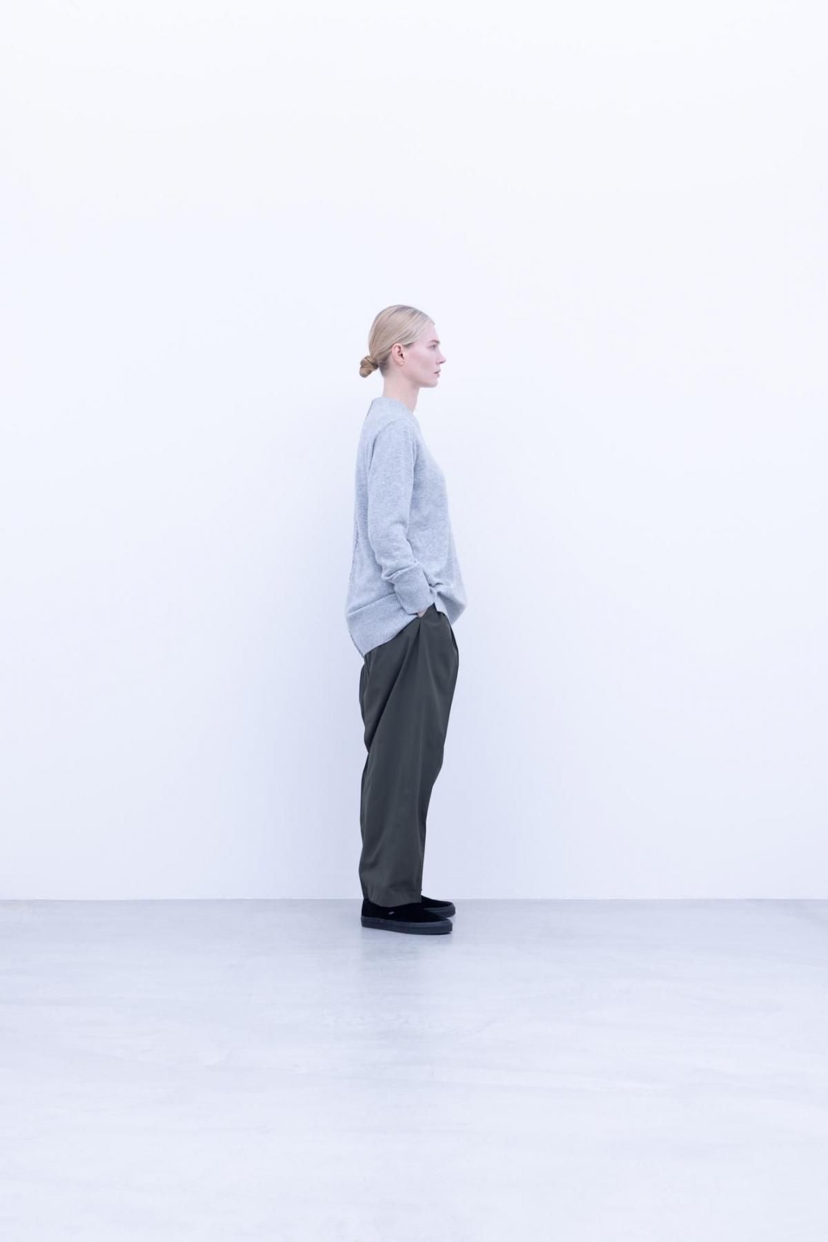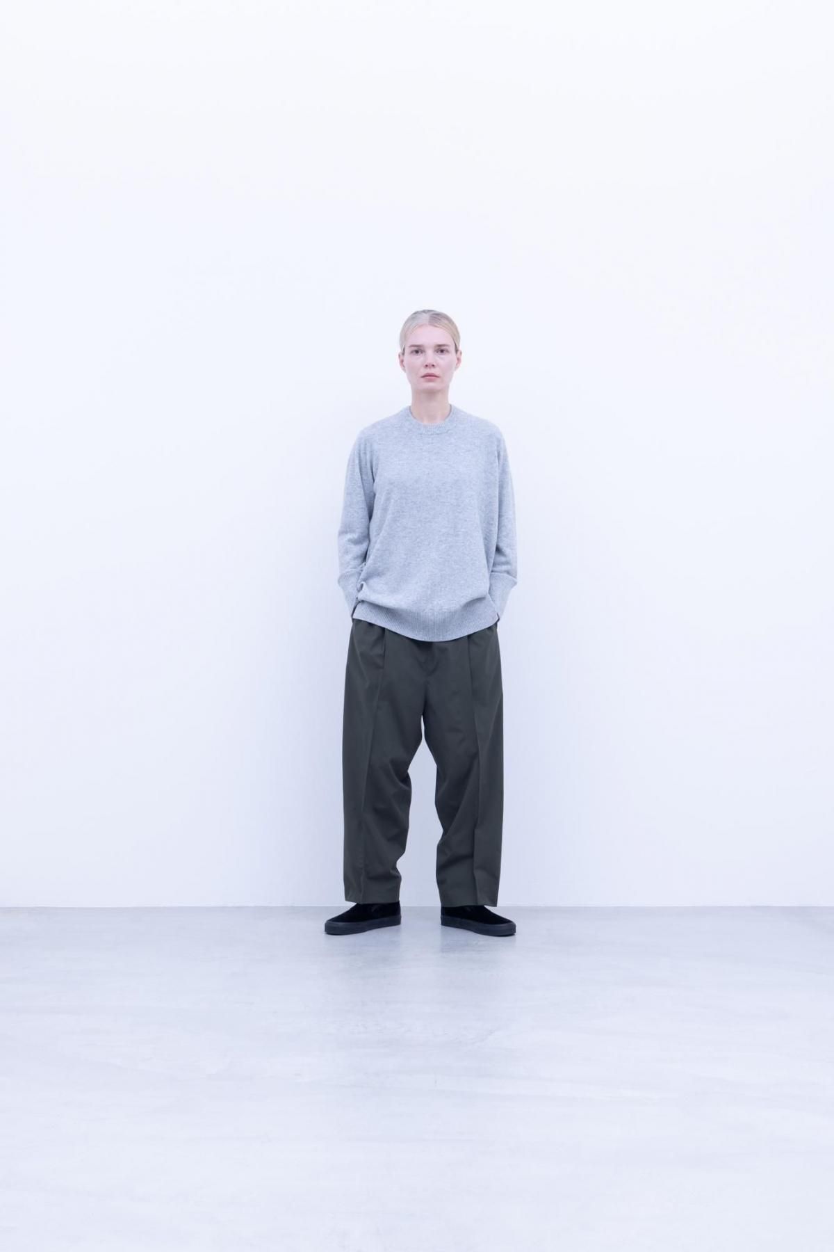 カシミヤ100%の26/2の糸を7ゲージor12ゲージの編機で編んだ横編みニットを使ったクルーネックニットです。