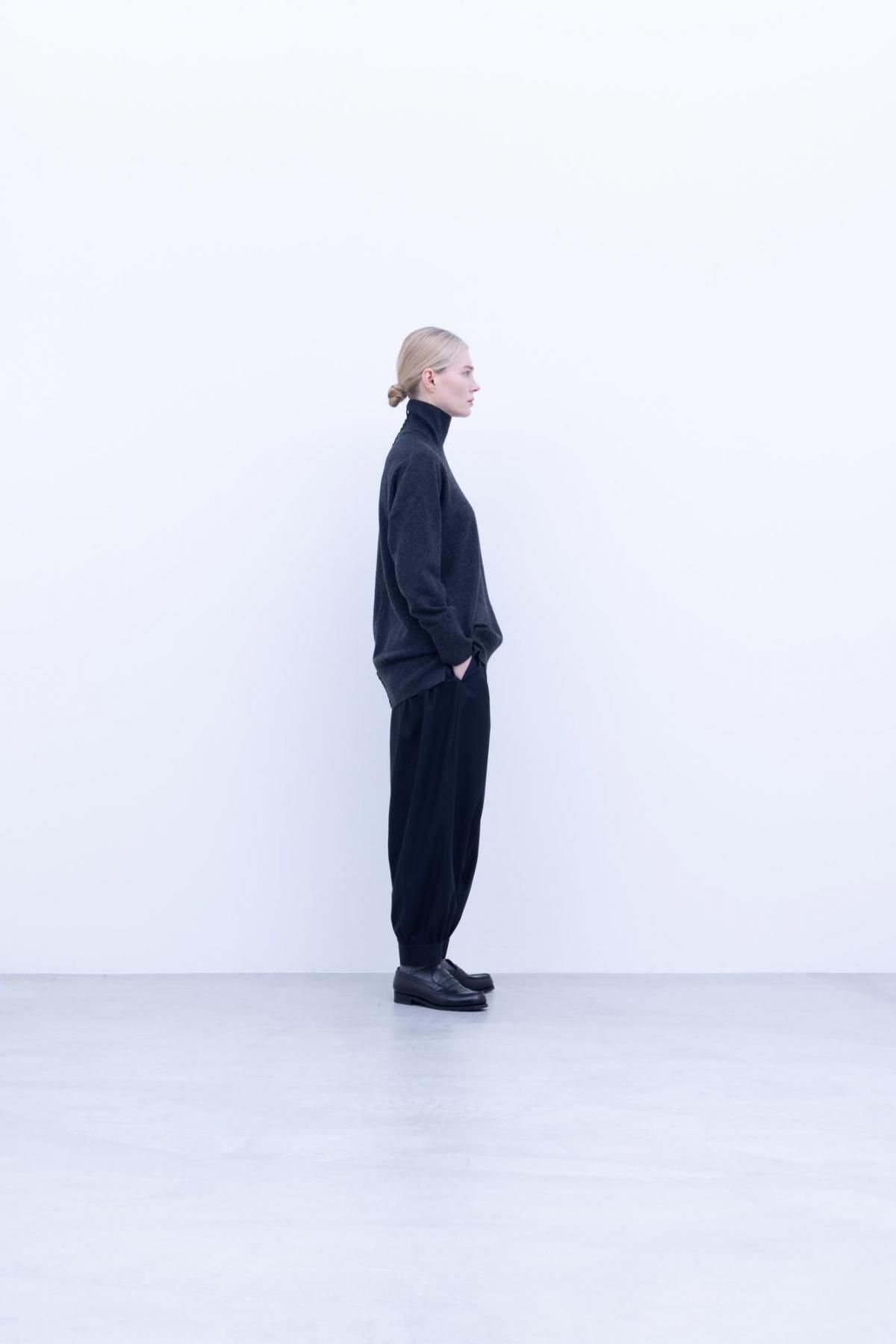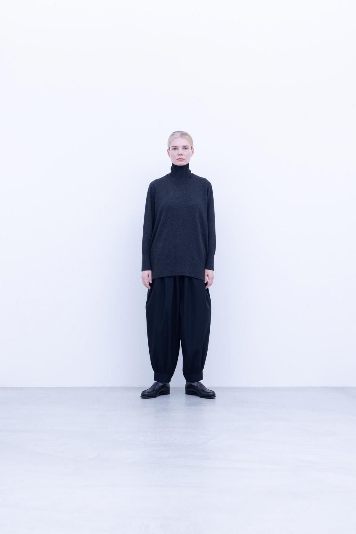 カシミヤ100%の26/2の糸を7ゲージor12ゲージの編機で編んだ横編みニットを使ったタートルネックニットです。