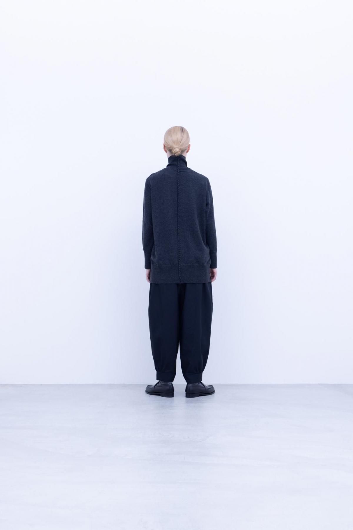 後中心にニット紐で編み込みされているデザインが特徴的ですっきりとしたシルエットなのでジャケットやブルゾンと併せたコーディネートも無理なく着用できます。またこの生地はかなり軽量で非常に軽く、身につけていて肌心地がとてもよいのでおすすめです。